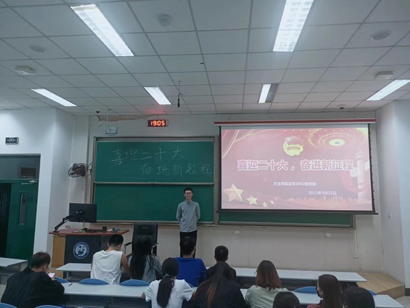喜迎二十大,永远跟党走,奋进新征程。9月22日,法学2002团支部于西环104开展以二十大为主题的本学期第一次团日活动,带领支部成员喜迎新时代。本次团日活动由团支书管彬棋主持。