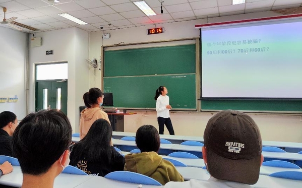 紧接着,李子宜介绍了诈骗的定义与分类,通过一则趣味视频介绍了如接触性诈骗、拾物平分诈骗等诈骗类型,并由此提供了在这些情况下可采取的具体应对方法,因其实用性获得一致好评。宣讲成员通过提问在场学生的方式进行简单的调查,并结合一系列数据向学生们展示了作为90后、00后更易受骗的事实;并从电信网络迅速发展、年轻人反诈骗意识薄弱等角度客观分析了原因,进一步警示学生需提高反诈骗意识的紧迫性。随后,宣讲成员通过普法的形式向在场学生介绍了《中华人民共和国反电信网络诈骗法》,简要阐释了关于办理诈骗刑事案件具体应用法律的问题并具体介绍了大学生如何反诈的具体手段,提高了学生在现实情况遇到诈骗找到正确有效的应对方法的能力。