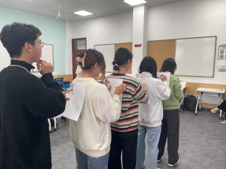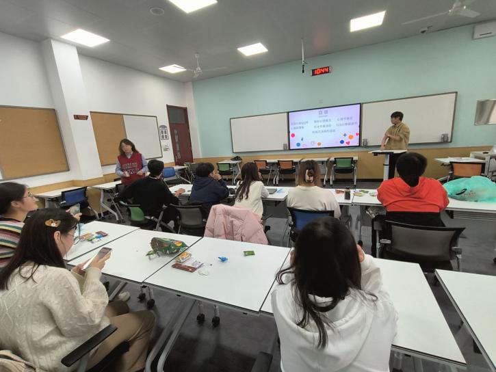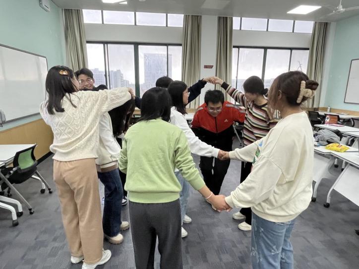 团辅活动从第一个游戏握手比赛开始,所有成员互相握手并询问自己感兴趣的问题。经过这个小游戏,心站成员之间建立了初步的印象与了解,气氛也活跃了起来。紧接着开始了第二个游戏后背画画,由主持人给每组的最后一人出题,全过程不允许说话,后面一名成员只能以在前一名成员后背画画的形式表达题目,不断向前传递,直到第一个成员将结果写出来。这个游戏锻炼了同学们的专注力与感知能力,放松身心,并让参与的同学们感受团队默契。第三个游戏是大风吹,所有成员围坐在一起,由主持人说大风吹,所有成员回应吹什么,主持人说成员身上有的物品或特征,被说到拥有这些特征的组员需要互换位置,所以会有一个成员没有位置,接下来就由这位成员担任下一轮游戏的主持人。同样还有另一个口令小风吹,被小风吹到的人原地不动,没被吹到的人需要互换位置。此活动帮助每个人找到自己的标志性优势,增强自我认同感,引导成员们在人际交往中学会交流与聆听,锻炼应变能力。最后一个游戏是心有千千结,所有成员手拉手围成一个圆圈,然后闭上眼睛向中间移动,随后睁开眼睛去拉之前左右相邻的同学,形成千千结,最后需要在不松手和换手的情况下解开所有的结。这个游戏启发成员们每个人都有一时解不开的心结,要正视它并勇于解开它,也强调集体的力量和思维的多样性,每个人的力量都是不可或缺的。
