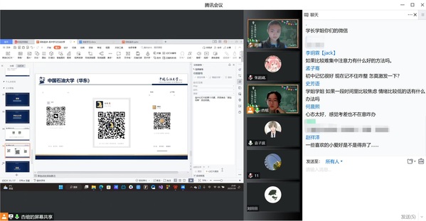 “高中学习过程中无法集中注意力怎么办?”“法学是不是要背很多东西,听说很卷?”翟瑞雪主持问答环节,耐心回答学生在高中学习、专业选择、报考及校园生活等各方面的问题,提供宣讲队成员联系方式、学校官网地址及中国石油大学(华东)招生宣传公众号以便后续交流沟通。