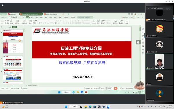 活动伊始,张润润以共享屏幕的方式,向全体与会师生详细介绍了石大的地理位置、石大校史以及杰出校友,让全体师生对石大有了初步了解,又对石大的特色专业以及优势学科作了详细报告,让全体师生对石大的以石油领域为主导的各个学科有了更加深入的了解;与此同时,队长赵中平对石大丰富的校园生活、优美的校园环境、浓厚的学习氛围等方面进行了详细讲解,得到了与会师生的集体认可。对石大的介绍结束后,与会学生积极提出自己的疑问,小队成员对学生的问题作了详尽的回答,学生对石大的好感与兴趣不断增加。队员齐寒也对学生们积极备战高考提出了一些建议,分享了对待考试、课余生活以及学习方法等诸多方面的经验供师生参考。会议最后,赵中平建立了中国石油大学(华东)QQ交流群,并将中国石油大学(华东)招生计划、石大官网、石大微信公众号分享至群内,供师生及时了解招生信息、专业建设等重要资料。临近会议结束,小队成员集体向全体师生表达了真挚的谢意,并向全体学生献上了高考必胜的真诚祝福。