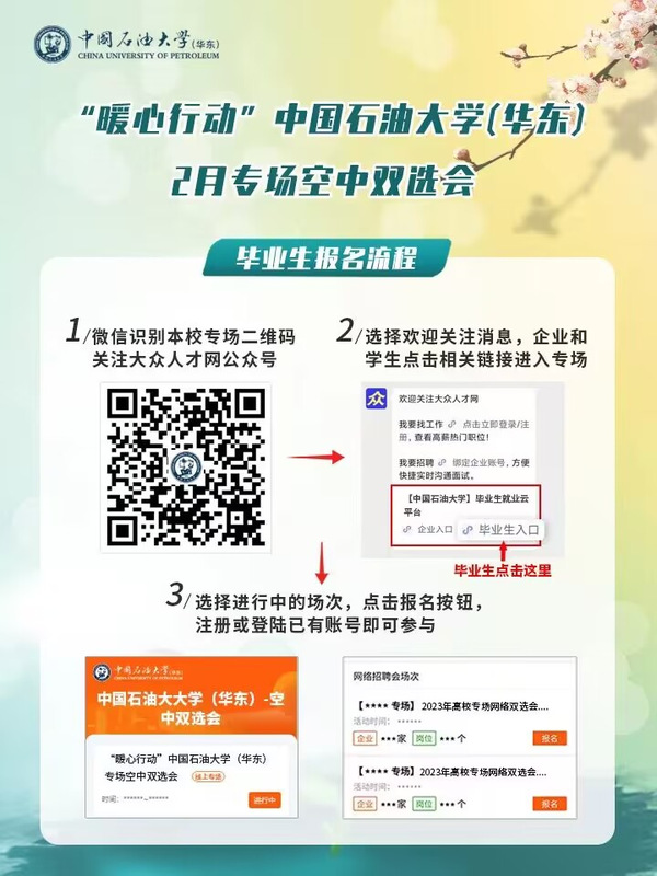 温馨提示:请同学们每天关注微信企业号——中国石油大学(华东)“学生就业工作”栏目,获取更多就业信息。