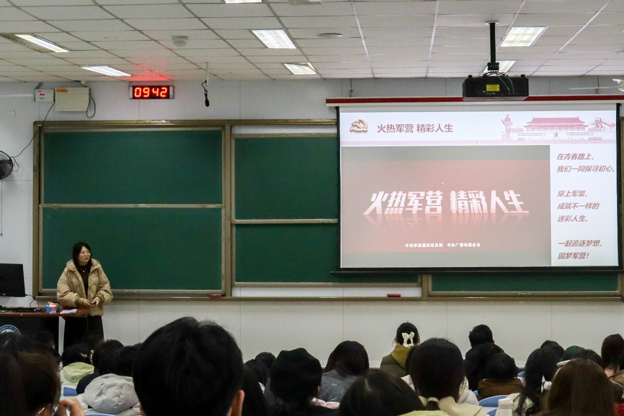 会议伊始,辅导员杨倩先从坚定理想信念的角度,鼓励大家“学习二十大,永远跟党走,奋进新征程”,深入贯彻党的二十大精神,并带领全体学生观看征兵宣传片《火热军营 精彩人生》,鼓励学生追逐青春梦想、投身强军兴军,成为担当民族复兴大任的时代新人。接着,她倡导学生们端正学习态度,树立明确目标,在新学期争创形成优良学风,营造良好的学习氛围。随后,对即将到来的考试周,杨倩着重强调诚信考试,以学生手册规定为依据,教导学生们文明考风、诚信应考,签署诚信考试承诺书,为上学期学习成果画上圆满的句号。最后,从加强安全防范的角度,杨倩提醒学生们注意寝室消防安全、谨防电信网络诈骗,同时鼓励学生们在平衡学业和第二课堂关系的基础上,积极参与丰富多彩的二课活动,不断提高综合素质。