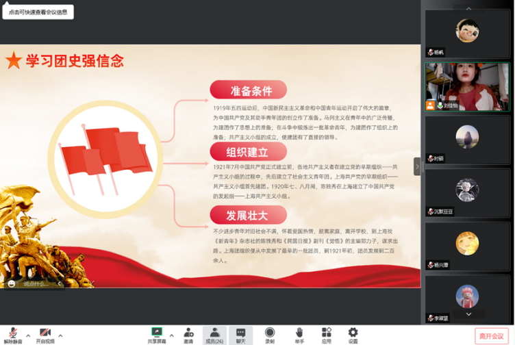 本次团日活动支部全体成员共同观看了由青年演员王一博、周冬雨为庆祝央视“百年礼赞”合唱的《年轻的朋友来相会》。“这首歌再一次让我们看到了老一辈人的精神传承,更是意味着美好的未来。从这首歌中我们用青春歌声礼赞百年,祝福祖国繁荣昌盛。”团支书刘佳怡如是说道。在“青年责任与担当”讨论环节同学们积极参与,踊跃发言:“清澈的爱,只为中国”“请党放心,强国有我”“风声雨声读书声,声声入耳;国事家事天下事,事事关心” ……最后,团支书刘佳怡总结概括了两个核心关键词:“紧跟党走”和“跟党奋斗”。