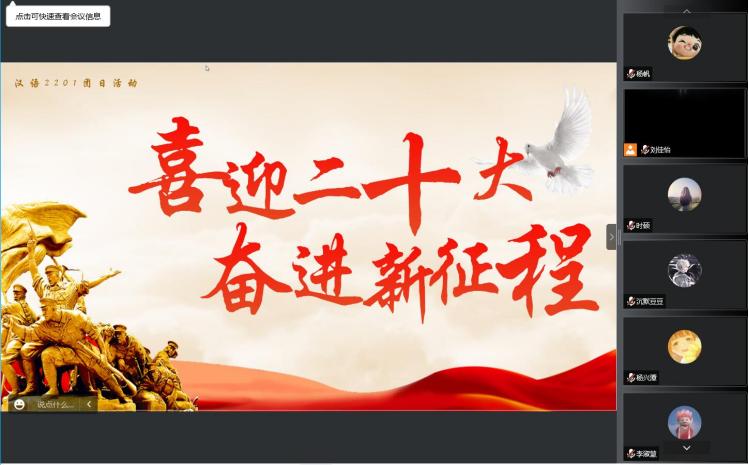 2022年9月24日,为组织引导广大学生领会贯通习近平新时代中国特色社会主义思想,学习其中的马克思主义立场观点方法,汉语2201团支部策划组织开展主题为“喜迎二十大,奋进新征程”主题团日活动。本次活动由600全讯白菜官方网站汉语2201团支部书记刘佳怡主持,汉语2201团支部全体成员参加。