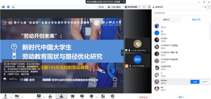 王兴伟以“劳动开创未来”——新时代中国大学生劳动教育现状与路径优化研究为例,围绕团队简介、备赛过程、项目背景、调研报告写作思路等分享了挑战杯课外学术竞赛的参与方式与相关技巧。他强调:“挑战杯绝不是空想,而是要切实落地去实践,把论文写在祖国的大地上。”