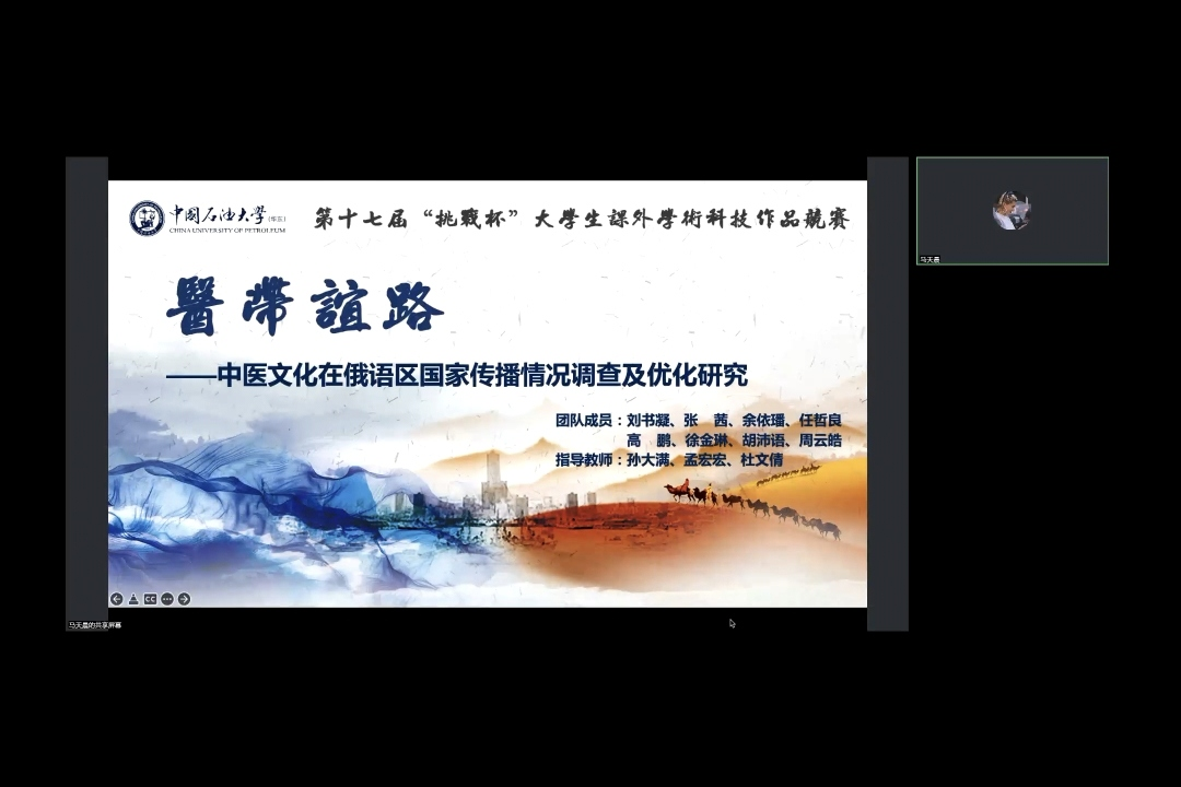 马天晨以“医带谊路”——中医文化在俄语区国家传播情况调查及优化研究为例,围绕项目研究背景、项目基础、调研方法、模型构建与优化、效果反馈和未来规划等内容,分享了她与团队参与第十七届“挑战杯”大学生课外学术科技作品竞赛并获得国家级银奖的经验。她强调“没有发现意味着一个不成功的调查,没有思想意味着是一个不精彩的调查。”突出了善于发现与思考对调查研究的重要意义。
