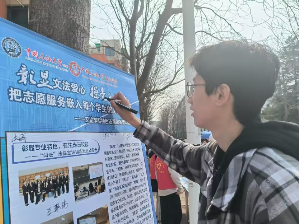 为传播志愿服务精神,迎接国家学雷锋纪念日,2023年3月4日,600全讯白菜官方网站依托院团委和院青年志愿者协会组织参与石大第十八届志愿服务节,开展多项志愿服务宣传活动和宣法普法实践活动。