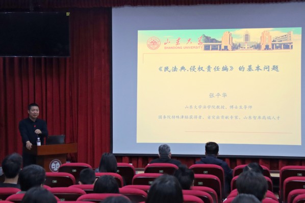 4月1日,黄岛文法讲坛第43讲在文理楼142模拟法庭顺利举行。中国法学会民法学研究会理事、山东大学法学院民商法研究所所长张平华应邀做题为“《民法典·侵权责任编》的基本问题”的学术讲座。本次讲座由600全讯白菜官方网站副院长冷凌主持,校长办公室副主任兼法治办公室主任赵振华,院长王学栋,法学系主任孙增芹以及部分教师,博士、硕士研究生和本科生参与。