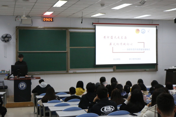 随后,校五星实践队“薪火相传”实践队进行宣讲,宣讲人介绍了实践队的发展过程和取得的丰硕成果,讲述2022年实践队成员跟随习近平总书记的脚步探索东营市高质量发展模式的故事,鼓励文法学子积极加入实践队,继续薪火相传践初心。校四星实践队“‘语’你同行”实践队宣讲人介绍实践队的主要发展方向是研究语言文字,并展示了实践队风采和实践成果。校三星实践队“齐风鲁韵”实践队宣讲人则展示了实践队研究“山东手造”的实践过程和实践成果。接着,文法法律宣讲团代表进行宣讲,介绍宣讲团成立的目的是为进一步贯彻习近平法治思想,加强高校学生学法、知法、懂法、用法意识。宣讲团秉承“学以致用,践行公益;服务社会,践行法治”的理念,采用视听结合、图文并茂、以案释法等多种方式面向高校学生和社区街道等进行普法宣传,将法治思想和法律知识传播开来。此外,宣讲团代表还表示欢迎符合纳新条件的同学加入宣讲团。