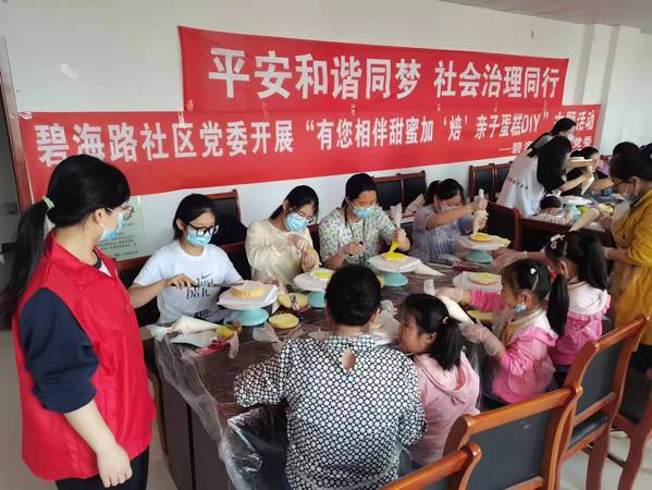 在母亲节来临之际,汉语2102团支部与汉语2202团支部部分支部成员于5月14日到碧海路社区参加碧海路社区党委开展的“有您相伴甜蜜加‘培’亲子蛋糕DIY”主题活动,支部成员与社区人员一起DIY制作蛋糕。