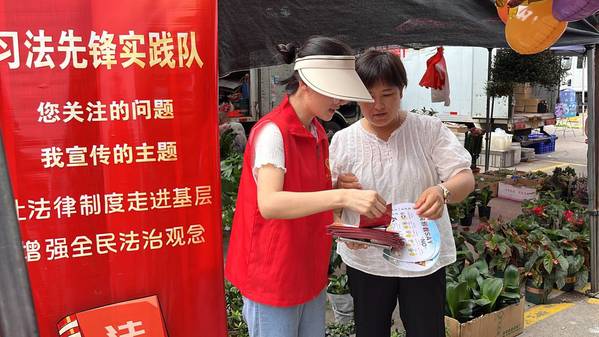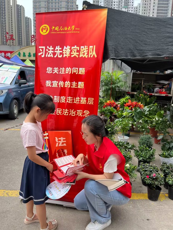 熙熙攘攘、热闹非凡的集市中,在支起的印有“您关注的问题,我宣传的主题”、“让法律制度走进基层,增强全民法治理念”宣传标语的易拉宝周围,孙丽颖和王铭萱在大小商摊、门店店铺之间穿梭,为不同年龄阶段的群体分发“习法先锋实践队”自制的普法纸质圆扇和《民法典》宣传页,向大家宣传反诈骗、消费者权益、法律小常识等内容。