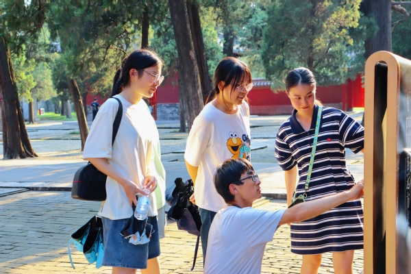 进入孔庙内部,实践队员们在浏览孔庙古树、殿宇、碑林等古迹遗存时发现众多景区保护修缮措施,例如古树套上铁箍固定圈防止树木劈叉倒伏和古代建筑加装防护网格阻止鸟类筑巢等。实践队员们漫步在静谧的孔庙中,随处可见的是祈福的文化装饰品和极富有儒家文化的文创设计,这无疑营造了古色古香的文化氛围感。参观完孔庙,当走出万仞宫墙后,实践队员们久久难以平复激动的心情。“不愧是孔庙!”其中一位实践队队员说道。