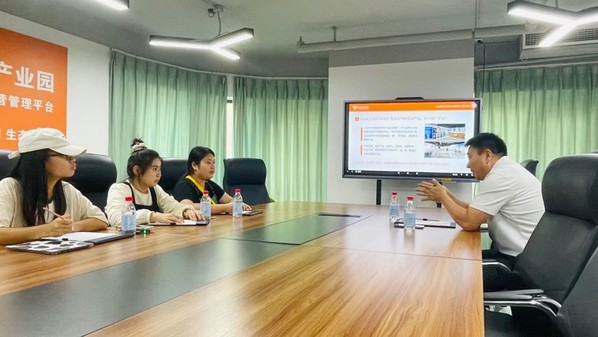 参观完毕后,实践队成员与公司负责人进行了访谈交流,大家认真聆听金海牛能源环境产业园的创立原因与发展历史,了解金海牛在推动双碳进程中的广阔平台作用。负责人称,公司以“行业集群、资源共享、精准链接、生态赋能”为特色,力在创建一个错位共赢、互相成就的易货平台,通过降本提效,实现新能源产业的时代赋能。