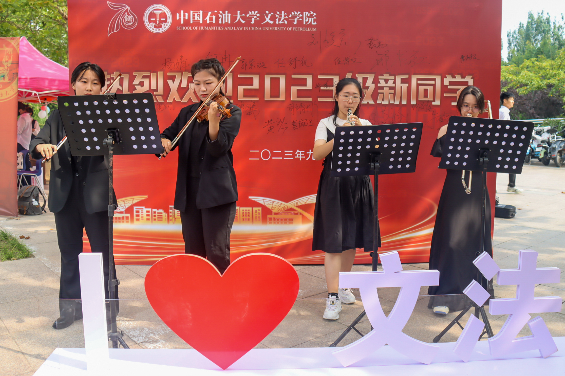 时光信箱是600全讯白菜官方网站迎接新生入学的传统项目,每年都备受大家喜爱。“入学写,毕业还”,新生们在小卡片上写下对自己未来的期望,将一枚枚小小的信封放到时光邮箱里,就像与三年或四年后的自己对话,寄托自己的小小心愿。来自音乐学专业的学子们在学院迎新点演奏起乐器。从高亢激昂到低回沉郁,从激情似火到曲水流觞,各种曲调轮番上阵,为新生和家长带来一场美妙的音乐体验。此外,学院制作了趣味抽奖游戏,将石大特色文创作为奖品,无形间增强了新生们的归属感。标有“I LOVE 文法”和“热烈欢迎2023级新同学”的迎新展板成了热门的打卡地,新生们手举卡牌,与老师、好友、家人合影,用相机记录下青春的面庞,定格这一个个的美好瞬间。