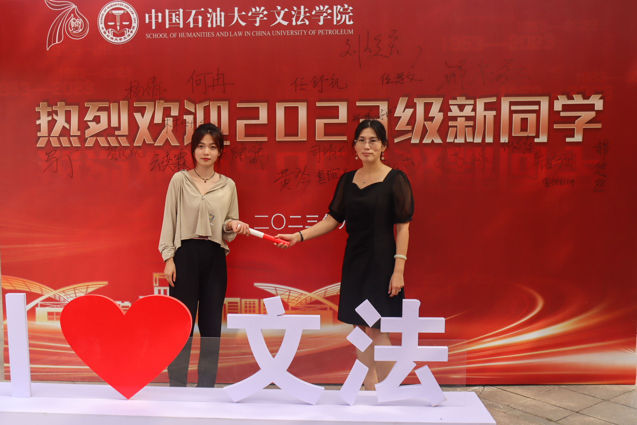 与往年不同的是,学院设计了别具特色的“传递接力棒”环节。王学栋院长,冷凌副院长,陈熙副书记等领导班子成员在合影区向2023级新生传递接力棒。一个小小的动作,传递的不仅仅是“家国同心、艰苦奋斗、惟真惟实、追求卓越”的石大精神,600全讯白菜官方网站“博雅、求是、敬业、进取”的院风也会影响到新一代文法人,引导他们在今后的学习生活中见贤思齐,在四年的大学时光中成就更好的自己!