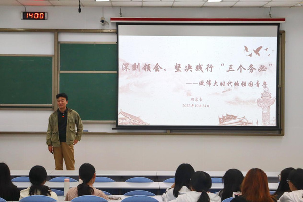 为了深入学习习近平总书记重要讲话精神,全面落实团十九大部署,持续聚焦团的主责主业,推进“青年大学习”走深走实,2023年10月24日, 汉语2201团支部联合青春领航宣讲团在西环201开展“做伟大时代的强国青年”主题讲座,马克思主义学院优秀学生代表周家豪主讲,汉语2201全体成员参与。