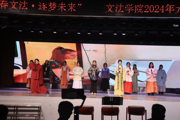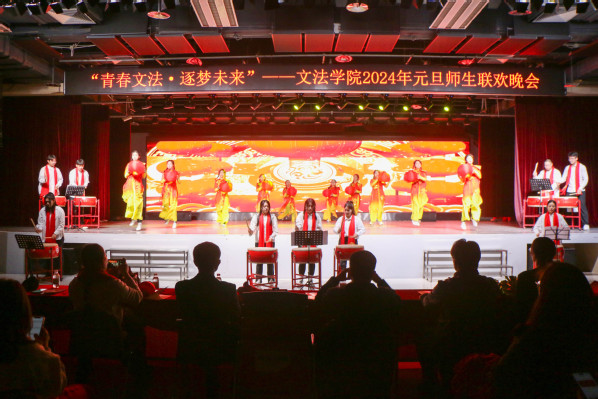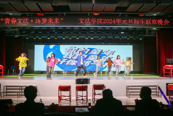 热烈青春,精彩继续。法律研2302班的歌舞《阳光男孩,阳光女孩》一出场便引发阵阵掌声。“你的童年,我的童年,好像都一样”,一首首音乐再次调动现场氛围,展现出文法学子乐观向上的积极态度。