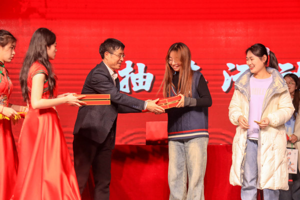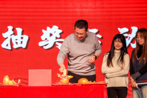 在精彩的节目过后,是激动人心的抽奖环节。党委书记姚成郡上台抽取号码,抽中的观众依次砸金蛋开出一、二、三等奖及参与奖,随后姚书记为参与师生颁奖,师生情绪高涨,现场气氛十分火热。