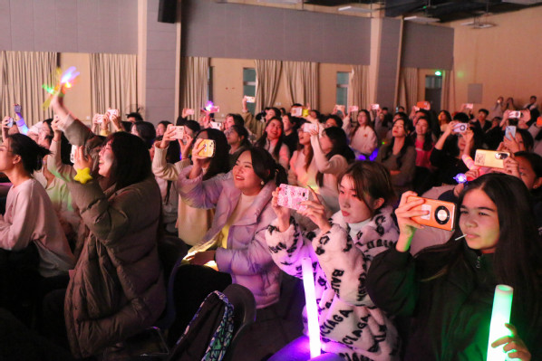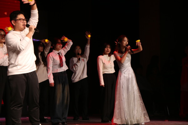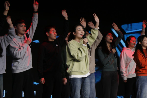 紧接着,法学研2301班带来歌曲串烧《我相信》,从男女声独唱《默》《白月光与朱砂痣》,到最后集体合唱《我相信》,在场观众大多自发加入合唱队伍,再次将晚会气氛推向高潮。
