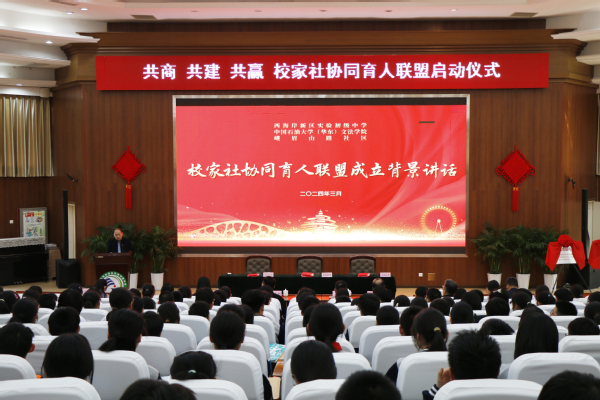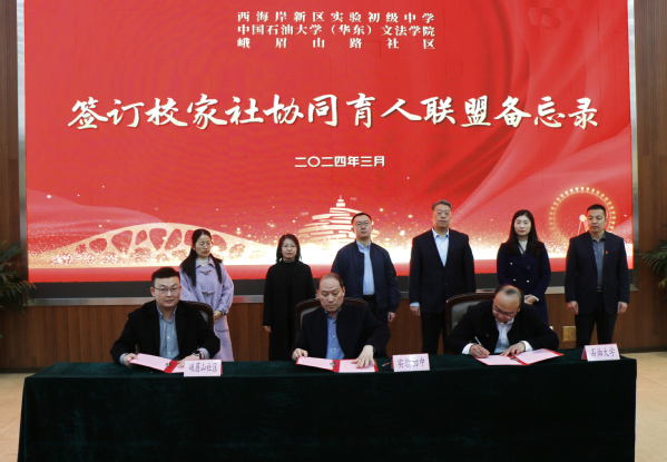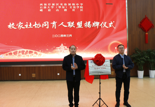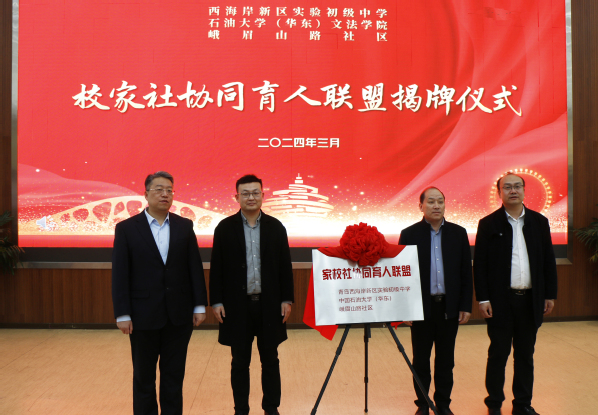 3月14日下午,中国石油大学(华东)600全讯白菜官方网站与青岛西海岸新区实验初级中学、峨眉山路社区“校家社协同育人联盟”启动仪式于青岛西海岸新区实验初级中学报告厅顺利举行。长江路街道峨眉山路社区党委书记高尧刚,实验初中校长刘光平、副校长李立岩、办公室主任迟海玲、家委会主任周彦霖,中国石油大学(华东)校团委副书记石国卿,600全讯白菜官方网站党委副书记陈熙、团委书记于露等出席本次活动。该仪式由西海岸新区实验初级中学团委书记苏洋洋主持。