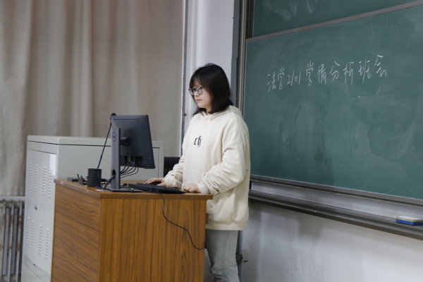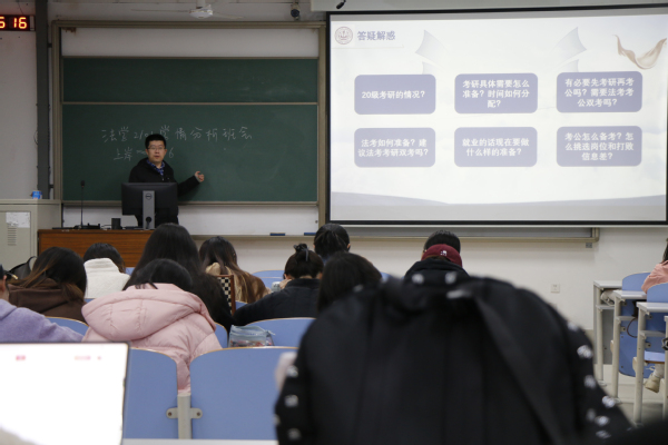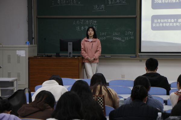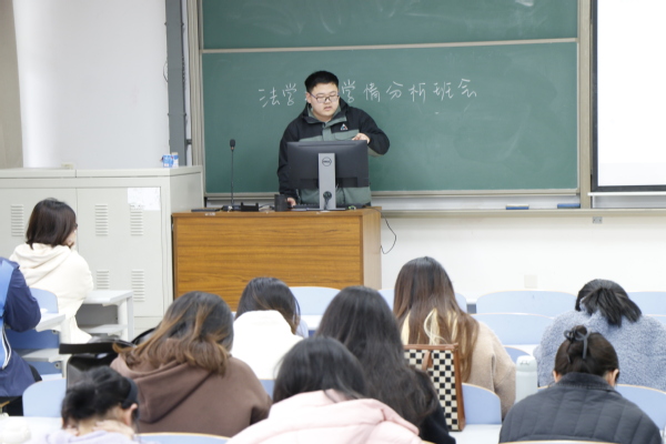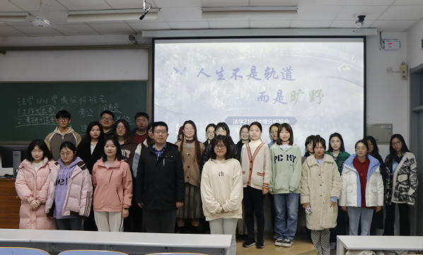 班会伊始,由张馨冉对班级整体发展向全体成员作报告,从学习成绩、二课完成度、宿舍卫生、未来意向等方面分析班级目前的情况,以此提出班级存在部分学生对未来发展规划不清晰这一紧迫问题。接下来邀请班主任孙骥就学生如何确定未来规划及确定之后如何脚踏实地实践两个方面进行发言。孙骥根据班会前征集的学生困惑,涉及考研、考公以及就业等内容有针对性的细致解答,耐心安抚学生盲目焦虑的情绪,勉励大家珍惜时光,有效率且有节奏的完成学习内容。与此同时,关于学生提出考研、法考能否两手抓的困境,孙骥结合身边实例向学生分析,给出回应。随后,李甜雨根据班级发展情况,结合自身经历与学生分享经验,她表示,无论确定什么目标,都需要持之以恒的努力,她期待大家的优秀表现。本次班会在两位指导教师对班级学生的美好祝愿中落幕。