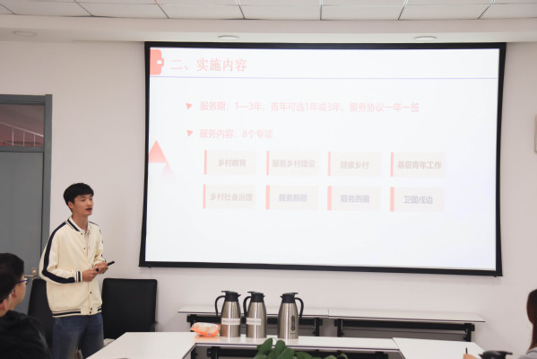 会议中,韩磊从项目介绍、实施内容、招募选拔、政策保障、发展优势五个方面对大学生志愿服务西部计划进行总体介绍。他从全国和地方两类项目展开,结合我校具体情况逐一分析“八个专项”的基本情况与选拔标准,明确公开招募、自愿报名、组织选拔、集中派遣和补录五大步骤的标准要求与操作流程。聚焦同学关注的政策保障问题,韩磊详细介绍了西部计划志愿者所享受的政策支持与资金保障、考核激励措施与服务鉴定体现。随后,韩磊围绕西部计划中的中国青年志愿者研究生支教团项目展开进一步讲解,从项目简介、项目价值与参与方式三部分全面介绍研究生支教团。“用一年不长的时间,做一件终生难忘的事”,他结合自身经历与感悟,引导学生们体会西部志愿服务的奉献与担当精神,鼓励学生们到祖国最需要的地方去实现青春梦想。