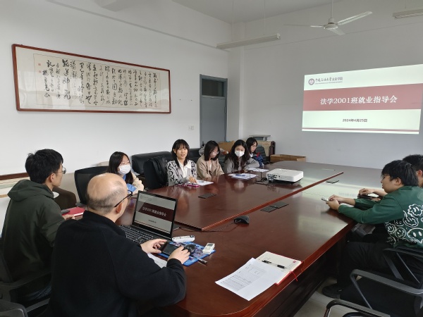 2024年4月26日,法学2001班于文理楼370开展就业指导会,班主任康雷闪、辅导员赵延升、李甜雨到会指导。