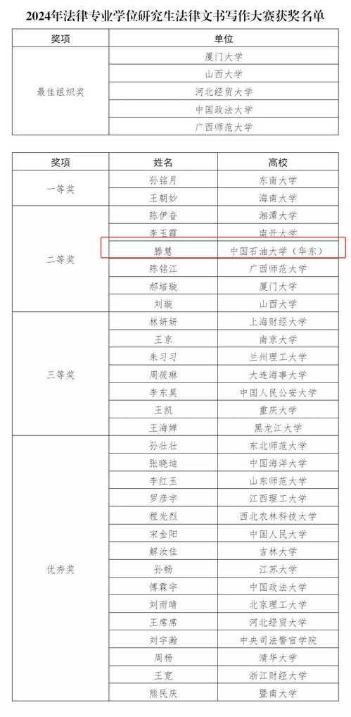 2024年6月1日,2024年全国法律专业学位研究生法律文书写作大赛总决赛在厦门大学举行。本次大赛由厦门大学法学院主办,福建天衡联合律师事务所协办,全国法律专业学位研究生教育指导委员会、中国法学会法学教育研究会作为学术指导单位开展指导,共有211所院校参赛。初赛以线上投稿方式进行,共收到3084份作品,80名选手入围复赛。复赛采用线上双机位方式进行,经过复赛的激烈角逐,30名选手入围总决赛。总决赛需要选手在三小时内完成一份法律文书写作,最终全讯2023级法律(法学)硕士研究生滕慧荣获2024年全国法律专业学位研究生法律文书写作大赛二等奖。