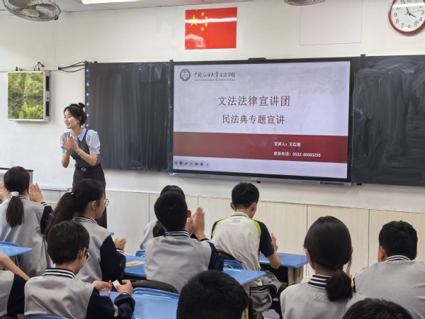 5月27日和6月7日,文法法律宣讲团成员王红艳、刘霄汉共同前往实验中学与珠江路小学,开展3次民法典进课堂宣讲活动,在生动的讲解和有趣的互动中普及民法知识。