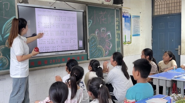 课程伊始,实践队成员吴若雪向学生们详细地介绍了歌曲《我和我的祖国》的创作背景和思想情感。《我和我的祖国》创作于1985年,由张藜作词,秦咏诚作曲,女高音歌唱家李谷一首唱,通过第一人称诉说了“我”与祖国之间不可分割的紧密联系,歌词中巧妙地运用了高山、河流、炊烟、浪花等美好意向,生动描绘了祖国的壮美山河和人民对祖国的热爱之情,既具有艺术的感染力,又将人们的共性激情完美融入,实现思想与艺术的高度结合。在这一过程中,实践队还通过视频、图片等多种形式,以红色歌曲为纽带,与学生一起回顾党的光辉历程、感悟革命题材音乐艺术作品中所承载的爱国情怀和红色精神。随后,实践队逐句讲解歌词含义,引导学生理解歌词内涵,并组织集体学唱,从音准、节奏,到情感表达,学生们跟着老师积极投入练习。在此过程中,队员们也注重鼓励学生之间互相交流、学习、共同进步。在掌握了一定的技巧后,学生们进行分组展示,一遍遍歌声响彻课堂,一张张面庞充满朝气,学生们用稚嫩的声音展示着他们健康向上的精神风貌。“我们在歌声中感受到党和祖国的伟大,这让我更加热爱祖国,珍惜现在的美好生活。”学生们在最后的总结活动中说道。