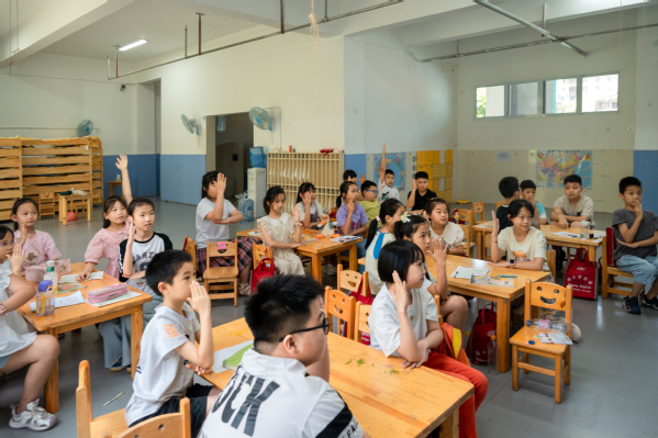 为了让普通话教学更加生动有趣,实践队成员精心设计了教学形式丰富的普通话教学课堂。课堂伊始,实践队队员巧妙地引导小朋友们自由发言,让他们用自己的话定义普通话。孩子们纷纷举手,“普通话就是学校里老师教我们的语言!”、“普通话就是可以让全国各地的小朋友都听懂的话!”,各类简单朴实的回答中透露出他们对普通话最朴素的理解。队员们认真倾听,并适时给予肯定和鼓励,为接下来的教学打下了良好的情感基础。