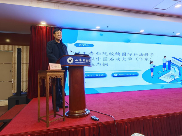 全讯国际法董金鑫老师应邀参加了此会议,并作专题发言。董老师以《理工专业院校的国际私法教学——以中国石油大学(华东)的实践为例》为题进行汇报、介绍我校涉外法治人才培育的情况,特别是2024年获批国家级首批涉外法治人才协同培养创新基地、山东省涉外法治人才协同培养创新基地后新成效举措,然后具体从我校国际私法教学现状中分析尚且存在的问题,并从特色课程的设置、科研融入教学以及强化师资力量等方面提出了改进思路。此次交流活动提升了我校在全国涉外法治教育领域的地位,为进一步培养特色型涉外法治人才积累了宝贵经验。