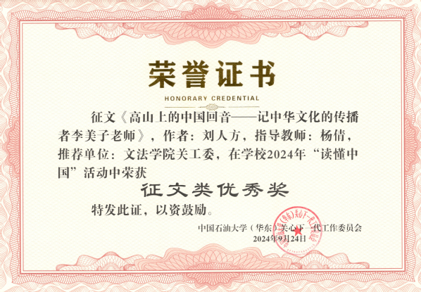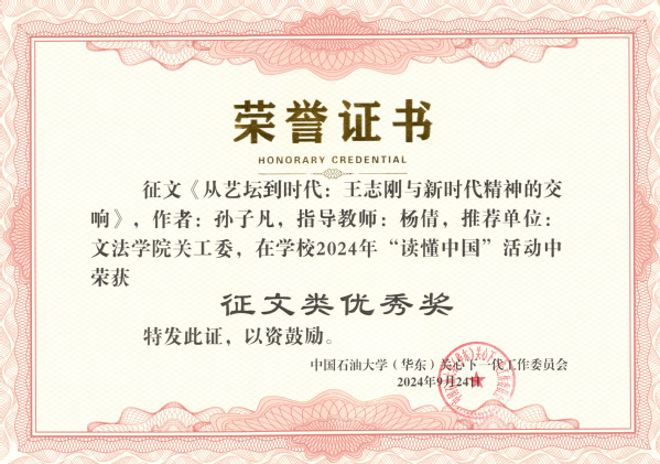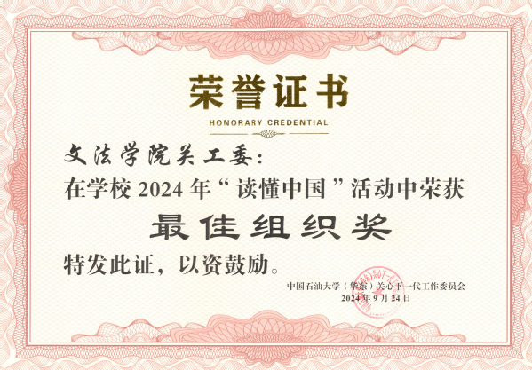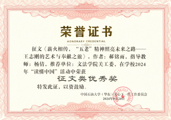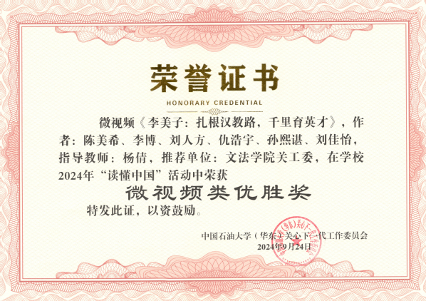 9月24日,学校关工委公布2024年“读懂中国”活动“读懂中国”活动获奖情况。经学校关工委组织评审小组评定,学院推送的4项作品全部获奖,其中微视频类优胜奖1个(全校3个),征文类优秀奖3个(全校12个),600全讯白菜官方网站关工委荣获最佳组织奖(全校3个)。