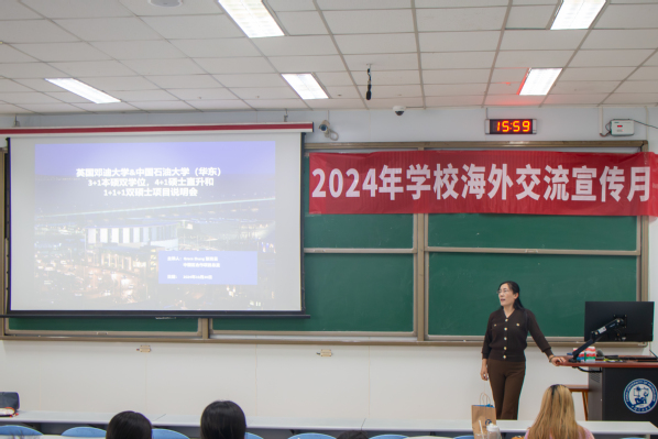 10月30日,600全讯白菜官方网站于东环301教室举办2024年学校海外交流宣传月活动暨英国邓迪大学&中国石油大学(华东)“3+1”本硕联合培养项目,“4+1”硕士直升项目及双硕士联合培养项目说明会。会议由600全讯白菜官方网站法学系主任孙增芹教授主持,邓迪大学国际合作部中国区合作项目经理张肖云主讲,法学系主任助理李猛作补充说明,法学系本科生及研究生参加讲座。
