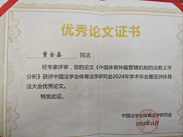 全讯董金鑫老师参加了此会议,并应邀作专题发言。董老师以《中国体育仲裁管辖机制的法教义学分析》为题进行汇报,认为通过对新《体育法》体育仲裁规定的法教义学分析,可以发现中国体育仲裁的管辖机制存在相当的特殊性,不仅与商事仲裁不同,而且并未一概照搬国际体育仲裁实践。首先,作为国家法律的授权与竞技体育活动组织化双重作用的结果,中国体育仲裁的管辖依据多建立在当事人拟制的仲裁合意。其次,关于管辖的事类范围,无论对处理决定不服发生的纠纷还是因运动员注册、交流发生的纠纷都属于中国体育仲裁的专属范围,而对竞技体育活动中发生的其他纠纷的理解则应关注单项体育协会内部争端解决的现有实践,不宜过于限缩解释。这不仅引起了与会者的热议,而且获得了广泛好评,为合理限定我国体育仲裁的管辖范围提供了新的思路。另外,其汇报依托的参会论文荣获本年度中国法学会体育法学研究会学术年会暨亚洲体育法大会优秀论文。