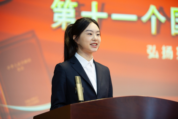 国家奖学金获得者、法学专业田一何作为学生代表发言。田一何结合个人学习和成长经历,分享了对于宪法的理解。她呼吁广大学子坚持以习近平法治思想为引领,将宪法精神内化于心、外化于行,积极参与到宪法的学习和宣传中去,共同学习宪法、遵守宪法、捍卫宪法。