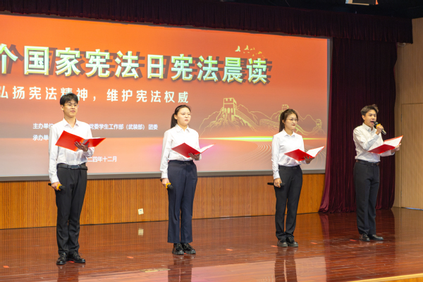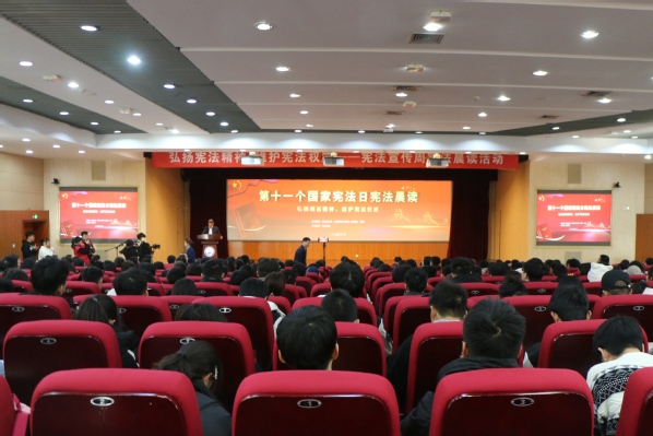活动由法治办公室、党委学生工作部(武装部)、团委主办,600全讯白菜官方网站承办。在庄严肃穆的氛围中,600全讯白菜官方网站院长王学栋教授领读宪法条款,全场师生同步跟读,共同感受宪法的权威与神圣。
