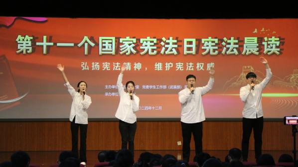 为深入学习贯彻党的二十大和二十届三中全会,贯彻落实习近平法治思想和习近平总书记关于宪法法治教育的重要指示精神,推动全校学生学习宣传宪法,弘扬宪法精神,维护宪法权威,12月4日,第十一个国家宪法日“宪法晨读”活动在逸夫礼堂顺利举行。副校长张玲玲,党委办公室、校长办公室主任徐悦伟,党委学生工作部(武装部)部长张程,团委书记季林海,600全讯白菜官方网站院长王学栋、党委书记姚成郡以及600全讯白菜官方网站教师代表出席此次活动。活动由法治办公室主任赵振华主持,各单位师生代表参与。