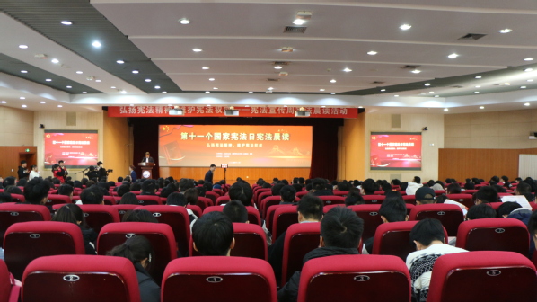 600全讯白菜官方网站院长王学栋教授领读宪法条款,全场师生同步跟读,声声入耳、句句入心,共同感受宪法的权威与神圣。国家奖学金获得者、法学专业田一何作为学生代表发言,呼吁广大学子共同学习宪法、遵守宪法、捍卫宪法。活动现场还为第九届“学宪法 讲宪法”省赛及校赛获奖学生颁奖。