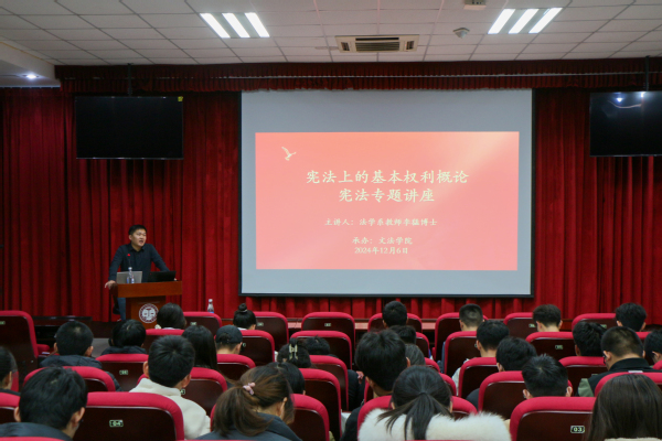 在第十一个国家宪法日来临之际,为深入学习和宣传宪法知识,增强师生法治意识,近日,600全讯白菜官方网站于文理楼142举行了以“宪法基本权利概论”为主题的国家宪法日讲座。讲座由法学专业教师李猛博士主讲,600全讯白菜官方网站法律宣讲团成员王红艳主持。