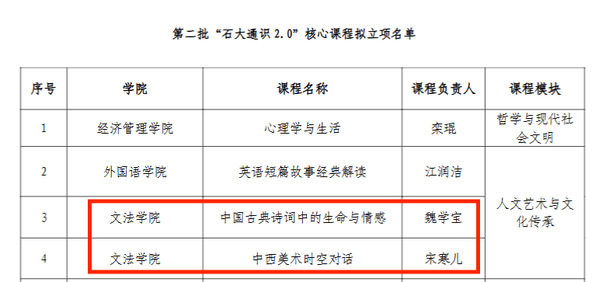 近日,学校教务处公布了第二批“石大通识2.0”核心课程立项名单,经个人申报、单位推荐、通讯评审、现场答辩,确定第二批“石大通识2.0”核心课程16门,其中全讯2门课程成功入选。