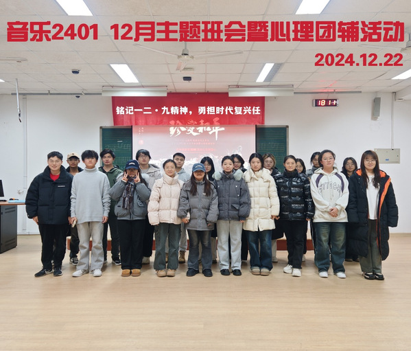 为纪念“一二·九”运动,传承先辈精神,增强学生的历史责任感与使命感,同时缓解期末压力,音乐2401班于12月22日在看台129教室成功举办了一场以“铭记一二·九精神,勇担时代复兴任”为主题的班会暨心理团辅活动。此次活动通过回顾历史、学习先辈精神、表演情景剧以及开展心理团辅游戏等多种形式,引导同学们深刻领悟“一二·九”运动的内涵,并在紧张的期末复习中进行心理调适,以更好的状态迎接挑战。