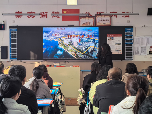 摆摊活动结束后,实践队来到高三(1)班进行宣讲。首先,队长李欣悦满怀深情地回忆起自己在高中的奋斗时光,表达了对母校培育的感恩之情,迅速拉近了与台下学弟学妹们的距离。接着,她通过精心制作的 PPT,从校园环境、教学设施、校园文化生活,到专业设置、师资力量、就业前景等多个角度,对中国石油大学(华东)进行了全面介绍,让学弟学妹们对石大的学科优势有了清晰认识。同时她也分享了自己在大学的学习经验和成长故事,以亲身经历鼓励学弟学妹们勇敢追求梦想,积极探索未知领域。