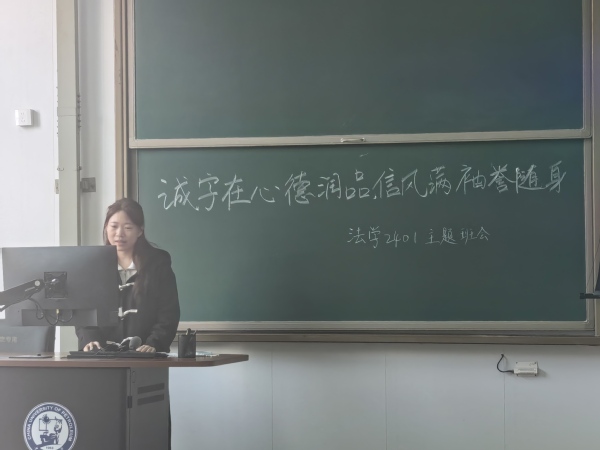 为深入贯彻落实社会主义核心价值观,弘扬中华民族传统美德,引导大学生树立正确的道德观念,4月11日上午,法学2401班于南堂120举办“诚字在心德润品 信风满袖誉随身”主题班会。本次班会由班长乔琪担任主讲,从修学诚信之品、研习诚信典例、模拟诚信困境、合签班级诚信公约四个环节展开。