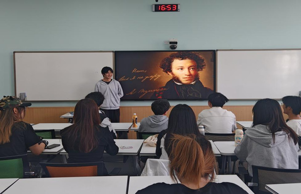 接下来,支部成员顾晨曦为大家带来了《普希金诗选》精选文段的分享。顾晨曦用饱含深情的嗓音,朗诵着普希金的经典诗歌。“假如生活欺骗了你,不要悲伤,不要心急!忧郁的日子里须要镇静:相信吧,快乐的日子将会来临。”那优美的诗句,在顾晨曦的演绎下,仿佛有了生命,带着同学们穿越时空,走进普希金的精神世界。分享结束后,顾晨曦还结合自身的理解,对诗歌的内涵进行了深入解读,让同学们感受到普希金诗歌中蕴含的对生活的热爱、对未来的希望以及面对困境时的乐观与坚强。
