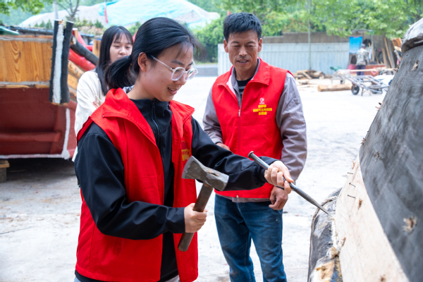 活动当天,王暖叶热情接待了法学2403团支部的学生们。他带领学生们深入船舶制造车间,系统讲解木船从选材、设计到组装的二十余道工序,并现场演示了传统造船技艺中的关键技术——捻缝防水工艺。王暖叶向学生们示范规范动作,将麻绳用斧头和錾子锤进船体木板之间的缝隙,再用艌料确保缝隙被完全填满,法学2403团支部成员在专业指导下动手尝试,麻绳的粗粝与斧头的沉重让许多人体会到传统工艺的艰辛。“看似简单的动作,实际操作却需要全身协调发力,稍有偏差便需返工。”团支部成员亓连洁感慨道。