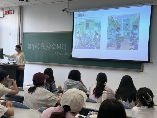 在知识讲解与案例分析环节,乔琪围绕校园、网络、人身财产、消防四大维度展开分享。讲解校园安全时,她列举了宿舍违规用电、实验室操作不当等隐患,并结合“学生用大功率电器引发火灾” 的案例,强调遵守安全规定的重要性;谈及网络安全,她详细剖析了刷单返利、虚假投资等诈骗类型,以 “同学轻信刷单被骗数万元” 案例警示,向大家传授了安装安全软件、不点开不明链接等防护要点;讲到人身财产安全,她借 “因忘锁门致财物被盗” 案例,提醒大家养成贵重物品妥善放置、随手锁门的习惯;说到“消防安全”,她提醒同学们重视学校定期开展的消防演练,掌握基本的消防知识和逃生技能,如正确使用灭火器、火灾发生时的逃生方法等。