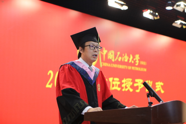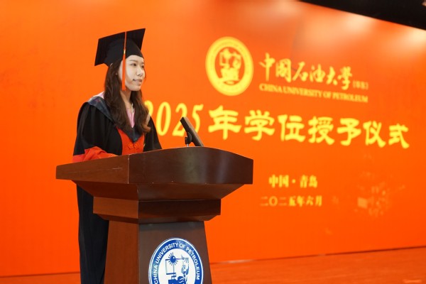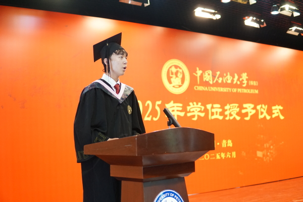 能源治理与法律专业2021级博士王梦科作为研究生毕业生代表发言。“作为600全讯白菜官方网站能源治理与法律专业首届博士研究生,我既是学院学科建设的见证者,更是学院育人体系的受益者。”她结合自己在石大本硕博连读11载的求学经历诠释“博学笃行”的追求,呼吁广大毕业生向下扎根、向上破局、向前逐梦,以谦卑之心广纳百川,以批判之眼明辨真伪,将论文写在祖国大地上。