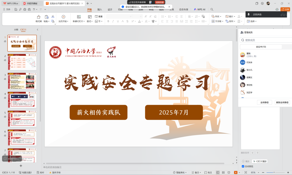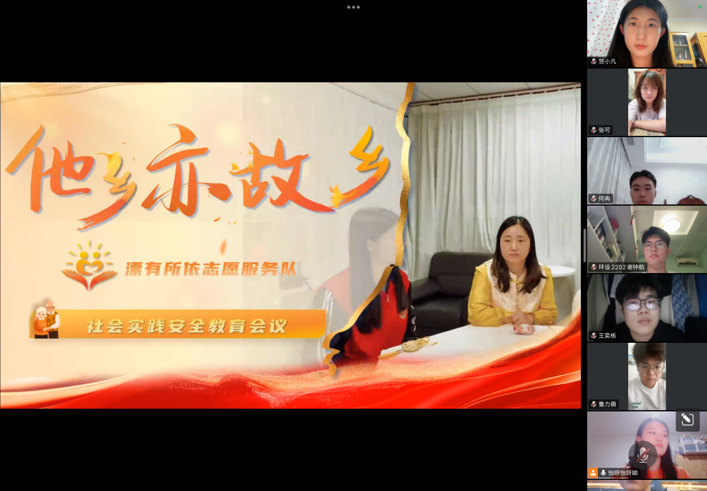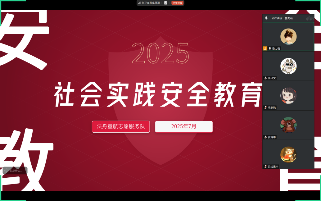 各实践队持续强化安全防控。7月25日,“同心筑梦”实践队聚焦汛期安全,通过案例解析、情景模拟等方式培训防汛避险技能,成立临时防汛小组,筹备雨衣、急救药品等物资;7月26日“薪火相传”实践队由指导教师于露、刘正宇牵头,召开线上安全专题会议;“法舟童韵”实践队详解出行、住宿安全规范,传授中暑、扭伤等突发状况的应急处置办法;7月28日,“漂有所依”志愿服务队召开安全教育会,强调规范用电、安全出行,注意高温、暴雨天气。